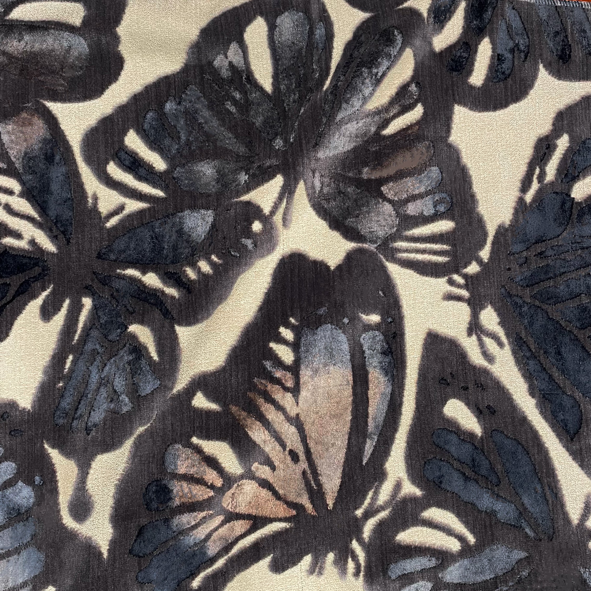 Flutter is a large scale butterfly cut velvet. The bold outline and watercolor print combine for maximum color and drama.